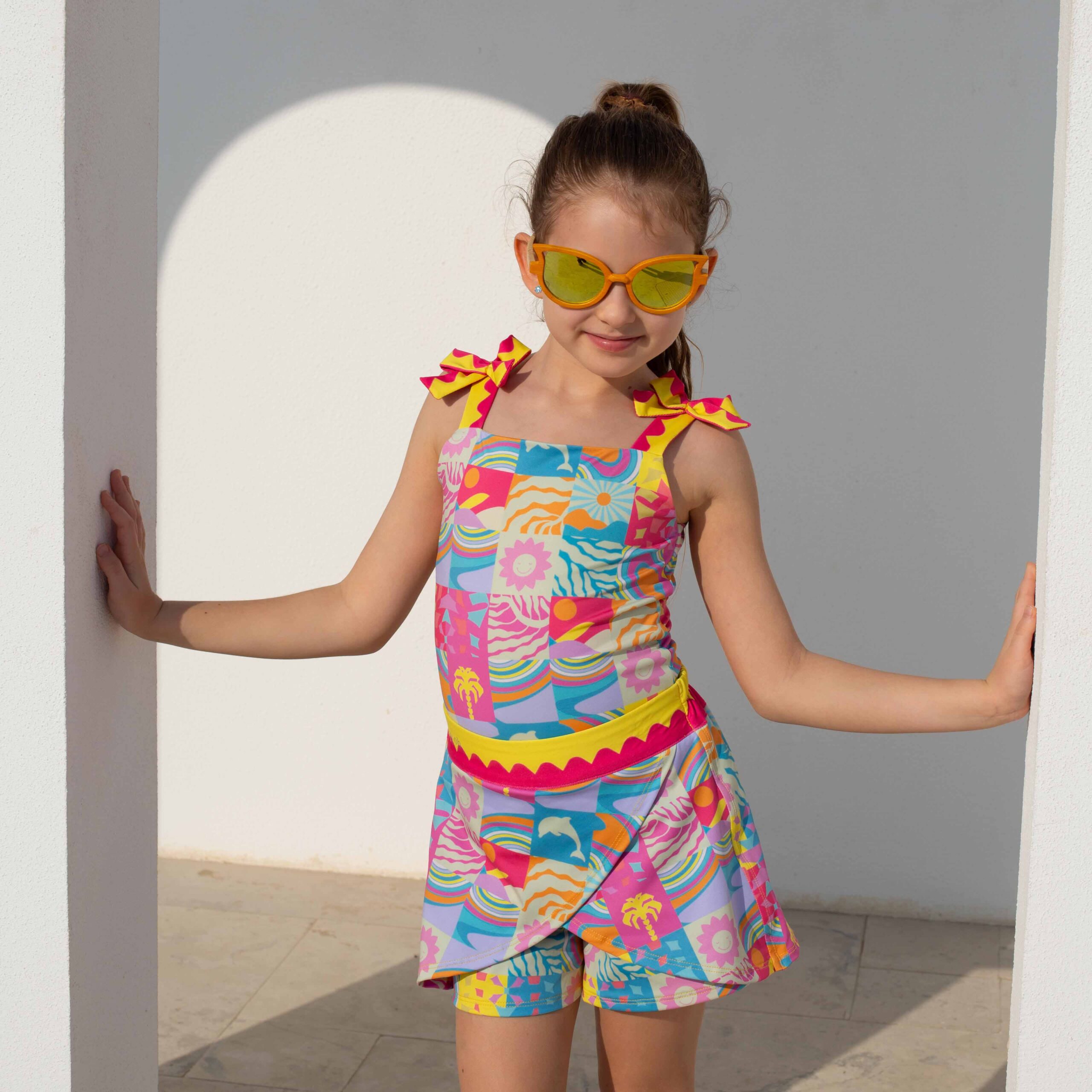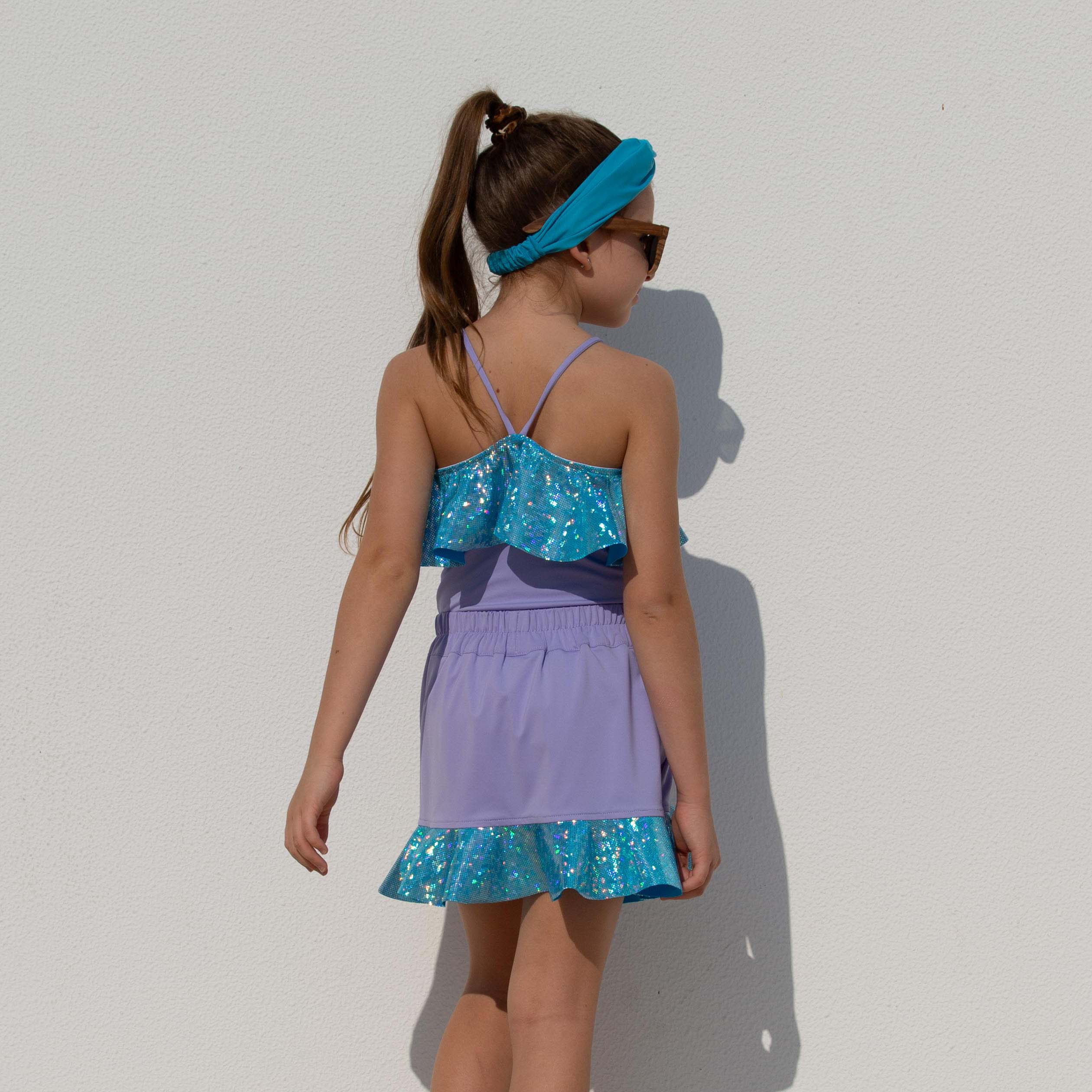 A playful two-piece set made for sunny days. The skirt features built-in inner tights for comfort and coverage. Add a matching headband or scrunchie, or twin with mom for a perfect match.